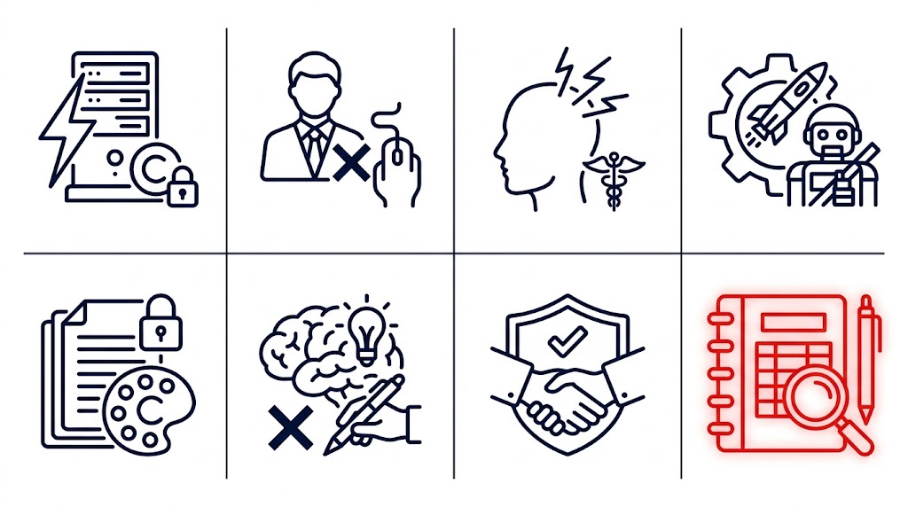 리스크 1 — 저작권: 미국 저작권청은 순수 AI 생성물은 저작권 보호를 받을 수 없으며, 프롬프트만으로는 저작자로 인정되지 않는다고 결정했습니다. AI가 생성한 이미지나 텍스트를 그대로 상업 콘텐츠에 쓰면 보호받지 못한다는 뜻입니다. 사람의 창작적 판단이 충분히 개입된 편집·재구성 작업이 병행돼야 합니다.