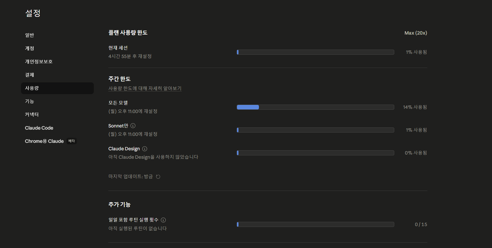 이 분량을 Max 5x 로 돌렸고, 한도 도달 알림은 단 한 번 발생했습니다 (대형 리팩토링 + 검색 도구 동시 호출 시점). Pro 였으면 같은 작업 첫 주에 매일 한도 도달이 잦았습니다.